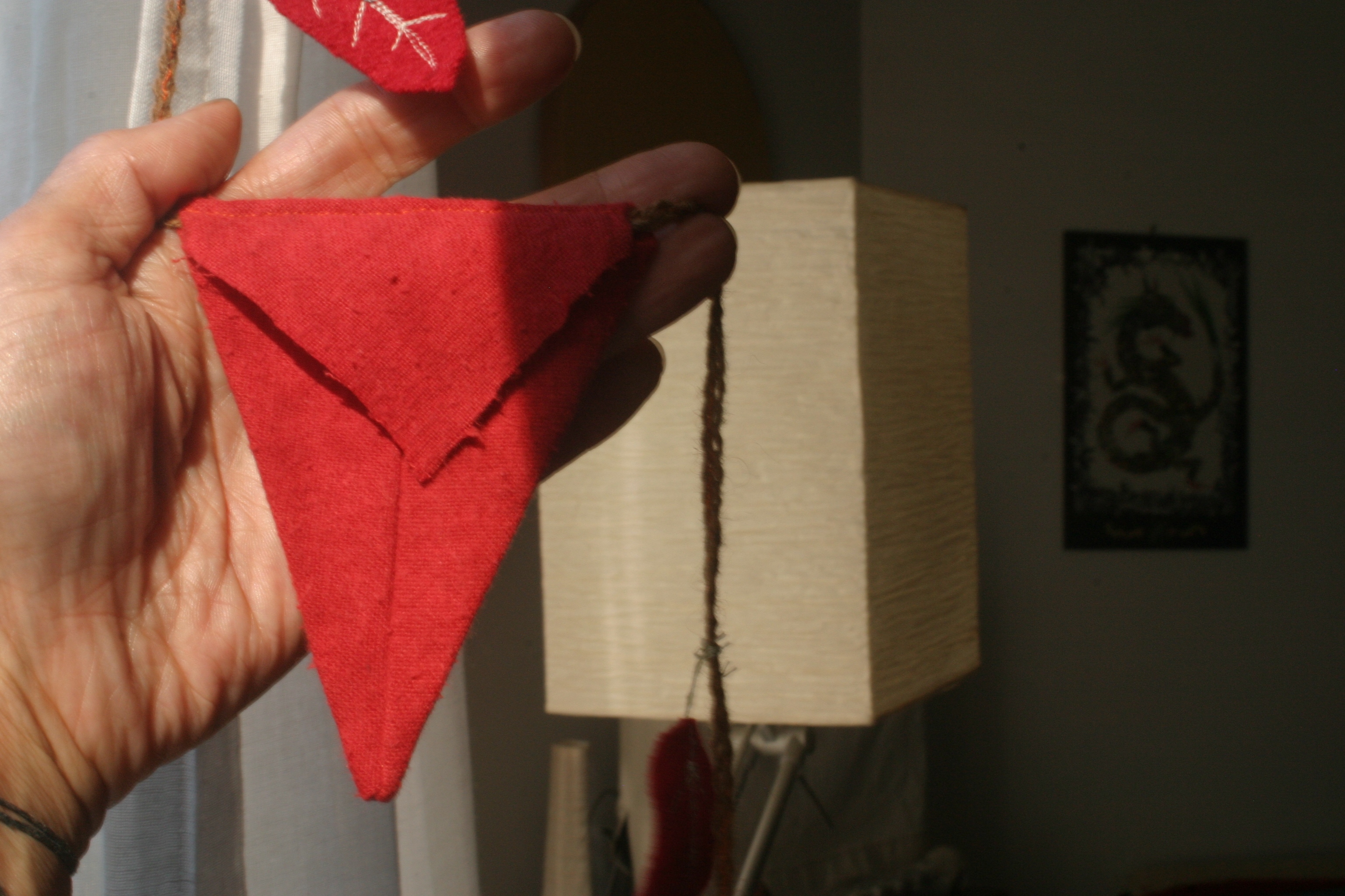 This garland was not easy to make. I was experimenting, you see: I wanted to make triangle-shaped flags from some squares of red flannel that I had cut out for another project ages ago. After some mild cursing and head-scratching I came up with a solution. Still and all, the garland took over four hours to make and was not, as I said, an easy project, nor will the backs of the flags withstand close scrutiny. The garland is made from red flannel triangles sewn to a long chain crocheted from sport-weight wool yarn, garnished with red wool felt leaves that I had cut out and machine-embroidered last year. The flannel was upcycled, the wool felt was thrifted, and the yarn I solar dyed with coffee this summer. (No, I’m not showing off, I’m just proving how daft I am.) After playing around with the spacing of the flags, I decided to add those red wool felt leaves. And as I was sewing the triangles on, I thought it might be interesting if I machine-stitched the crochet chain between each triangle as I went along, so that’s what I did. It made for some fussy machine-work (really, I had to cheat a bit, as the chain would stretch like the dickens as I approached the next triangle), but I like the way the orange thread looks stitched through the brown wool.