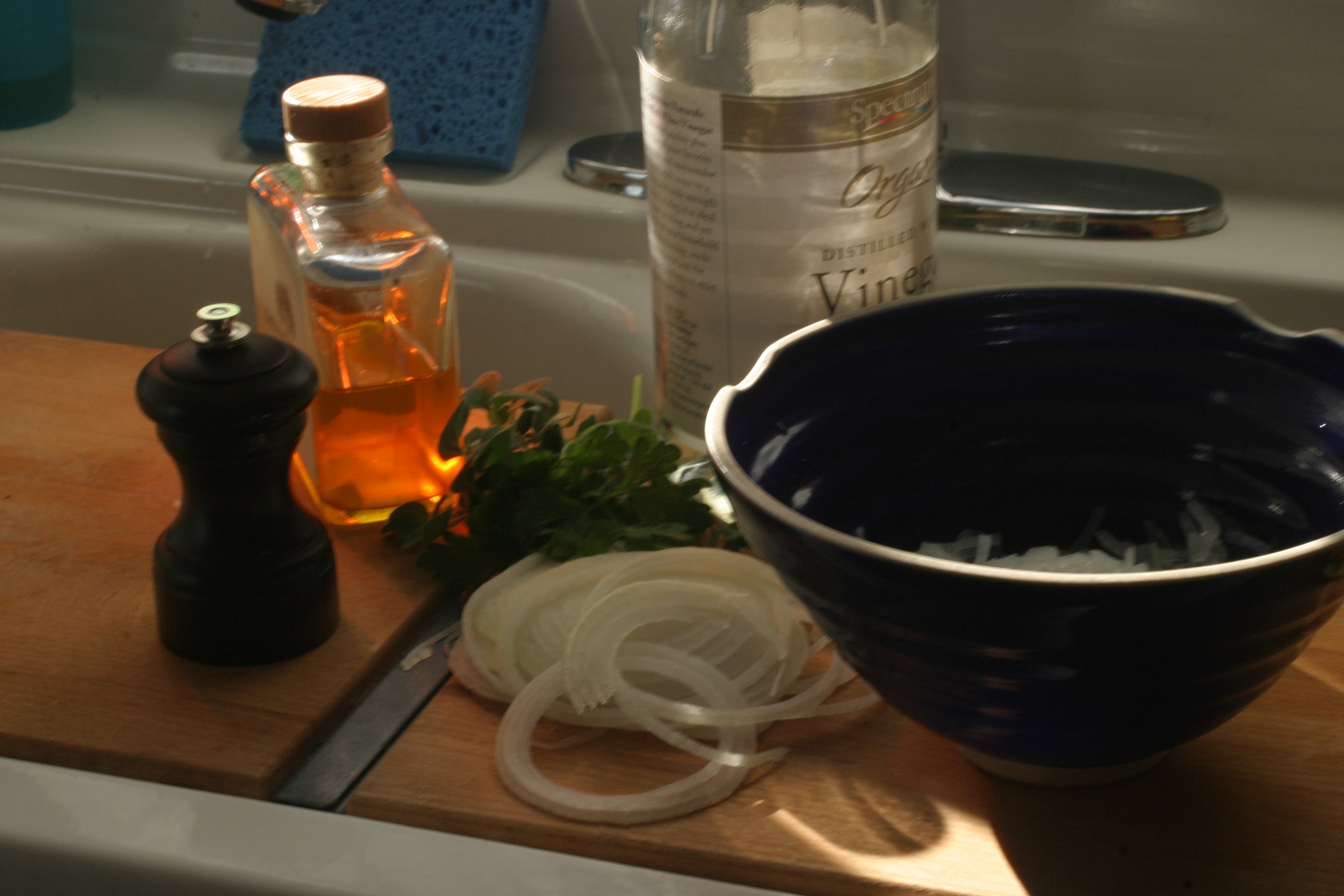 Thinly slice the onion (on the madeline or by hand). Wilting onion slices is laughable simple: transfer the thinly sliced onion into a bowl and add about a quarter cup of vinegar. Using your hands, toss the onion in the vinegar, squeezing thoroughly as you go. The onion will break down and turn translucent in places. Let the onion vinegar mix sit for a few minutes while you prep your fresh herbs. I used a combination of parsley, and spicy oregano and marjoram, harvested minutes before from the pot of herbs that lives on our back steps: