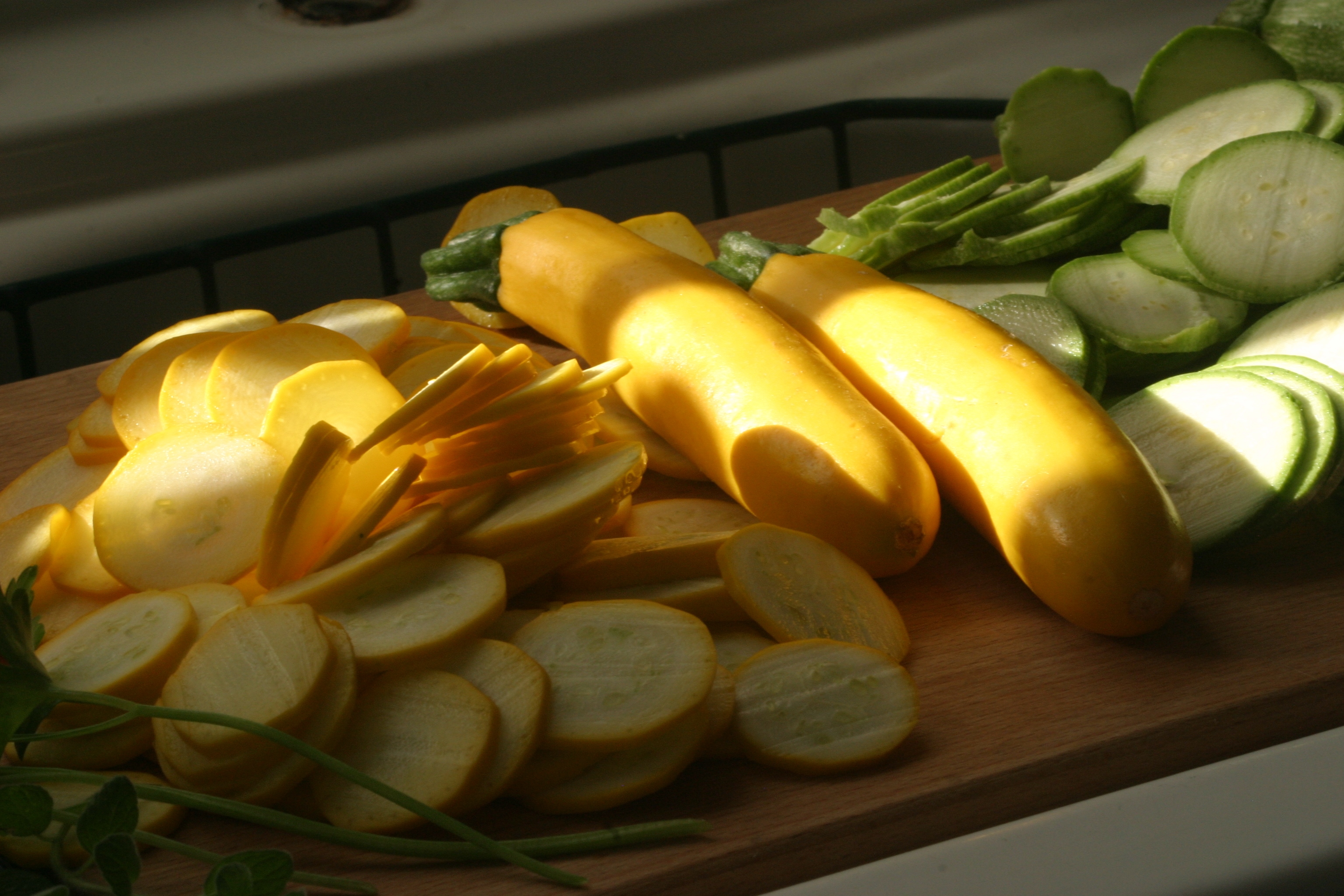Houseproud homestead kitchen – piles of thinly sliced summer squash, ready to be salted and made into a salad.