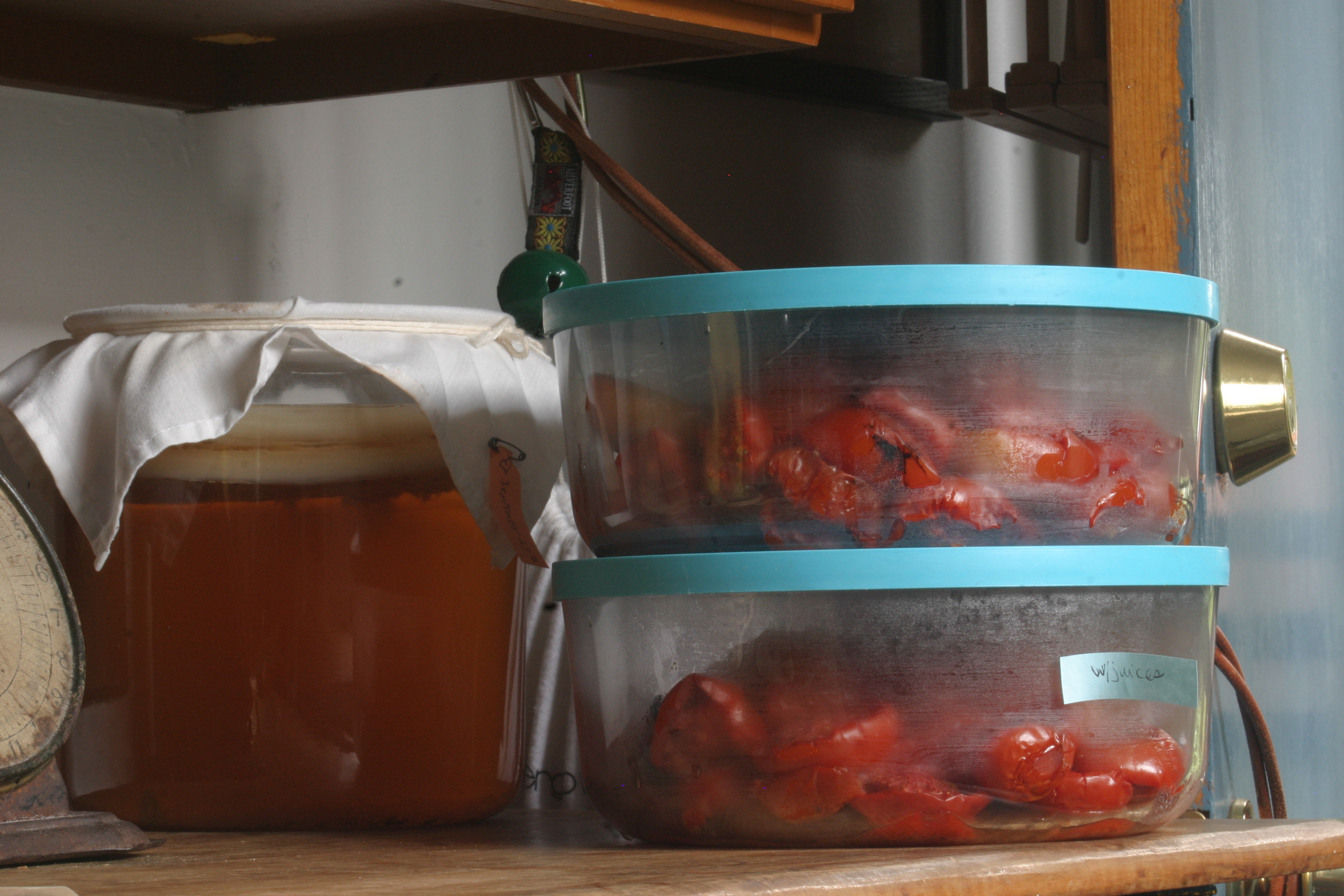 Thing’s have been hopping at the Houseproud homestead: it’s canning season! Well, technically, it’s preserving season at the homestead, and I’ve been at it to beat the band. Observe, s’il vous plaizzzz, the bounty that our kitchen (and local farmer’s markets) have produced! From right to left, there’s a batch of wild yeast sourdough starter brewing; bottles of hard cider and kombucha; jars of tomato sauce, a small bowl of hot peppers fermenting, and a large bad o’ dried zucchini slices. Not in view is a pint bottle of hot pepper-infused vodka (it’s lurking on top of the fridge, out of view of the camera, but not to worry – there’s a close up of that bottle of firewater below). I say unto you, Houseproud household will be eating well this winter.