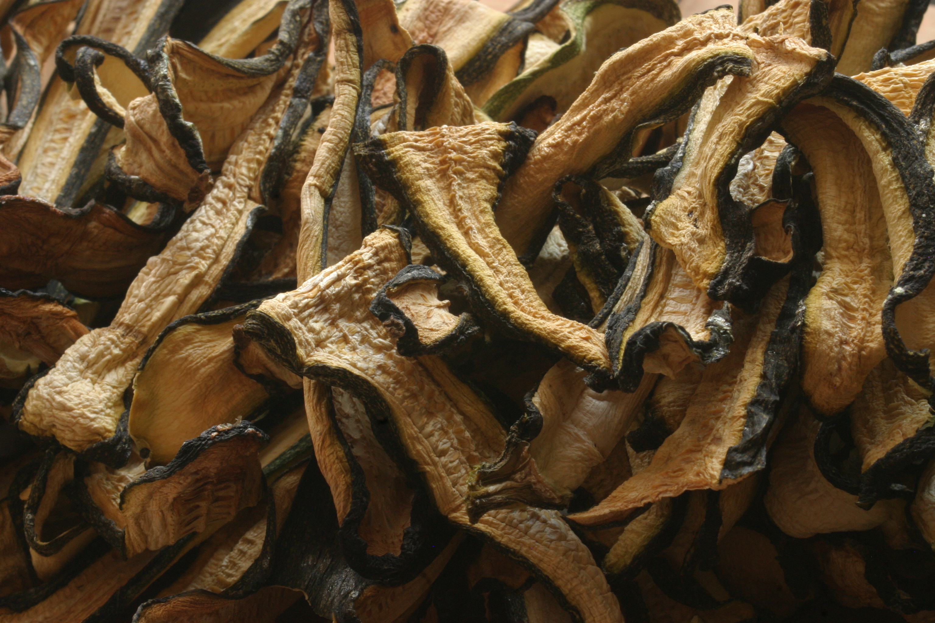 I put the slices directly on the oven shelves (no seasoning or oil needed). Set the oven as low as you can (150 – 200 degrees), and slowly roast for two hours. Turn the oven off and leave the slices in the oven for a few more hours. Repeat the process of roasting / resting a few more times the first day, and then again the next day. After two days the slices will be dried and leathery. If you have time, you can keep the drying process going longer (the drier the slices, the more shelf-stable they will be). If you can’t and the slices aren’t bone dry, you can bag them up and put them in the freezer, where they will last for months and months.