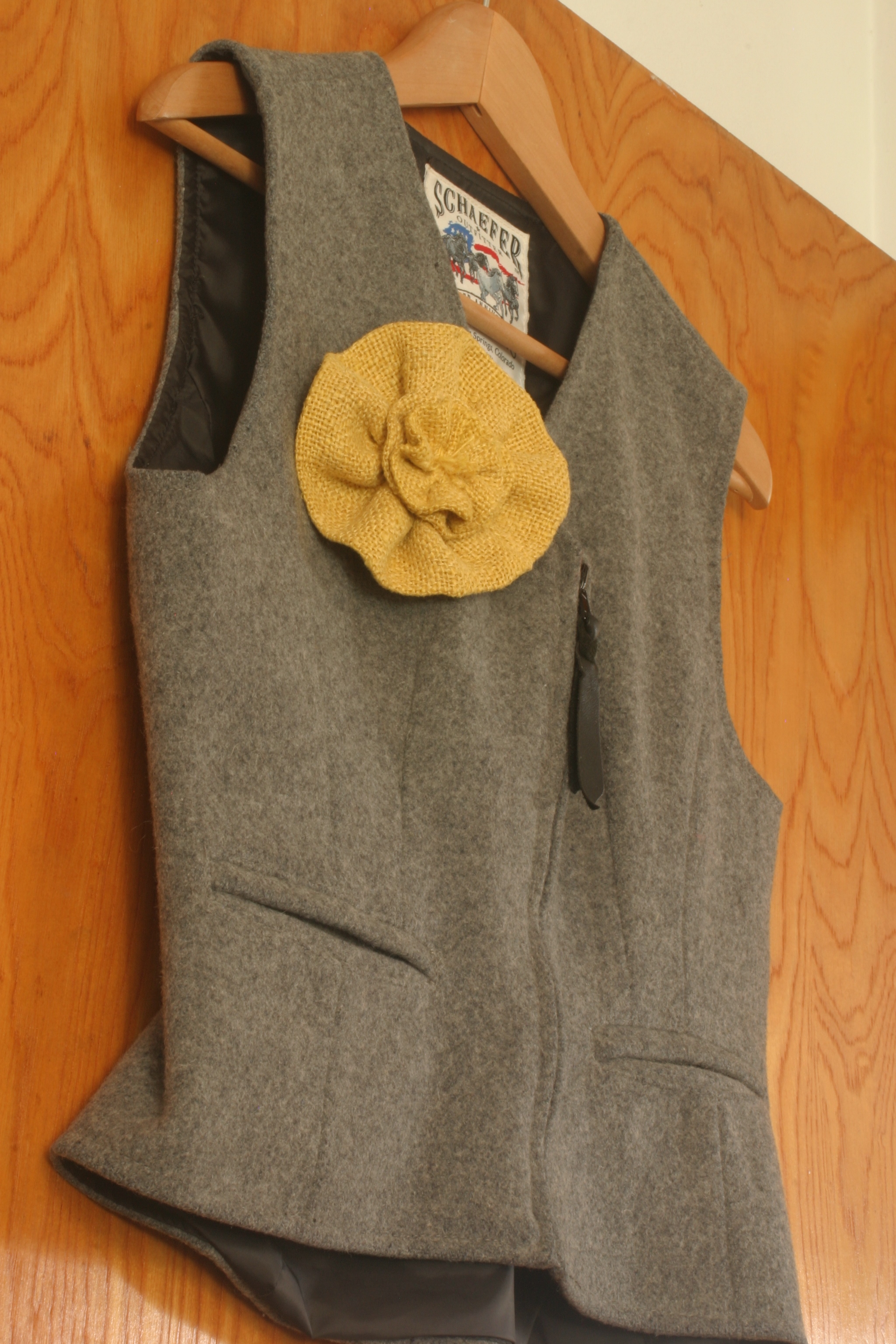 Ain’t that pretty? That was a close-up of a yellow burlap flower pin that I made last week. You might recall that in last week’s post I mentioned I was trying to puzzle out the components and design of a fall-inspired wreath that I’d like to hang in the Houseproud homestead’s living room. The flower pin is exactly what I wanted: a bright splash of color to wear as the days get dark and grey. I think I’ve worn the pin pretty much every other day since I made it … Here’s what it looks like from afar: