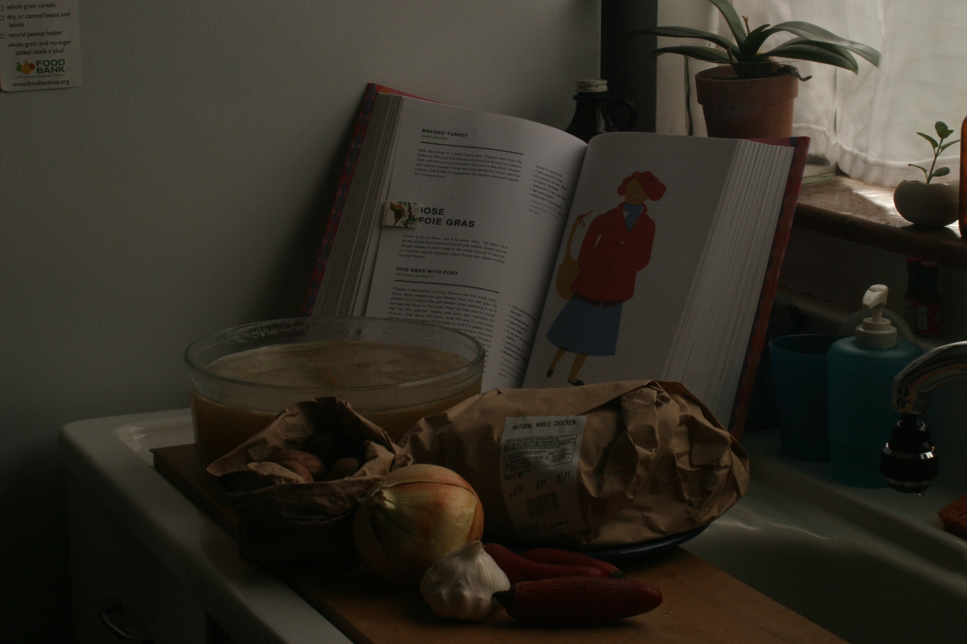 A pot of simmering chicken stock hides behind a skillet of chicken to be braised. That’s a happy sight to see, innit? Not so happy were the neighbors, who must be pretty sick of hearing our kitchen fan on for hours and hours and hours.