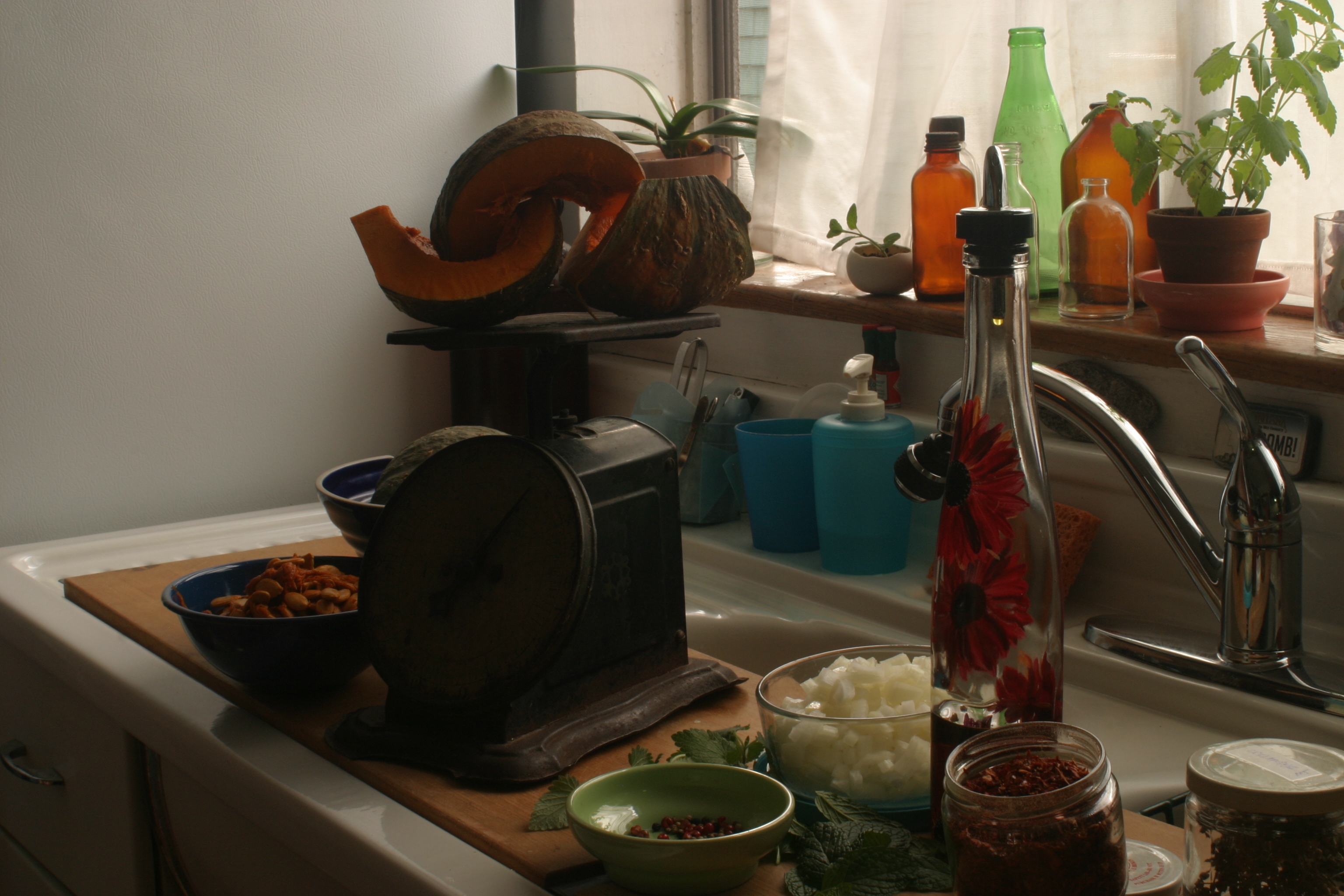 Ingredients for Deborah Madison’s winter squash soup, as provided by this month’s Sunset magazine. Having a kitchen scale is a godsend, really it is.