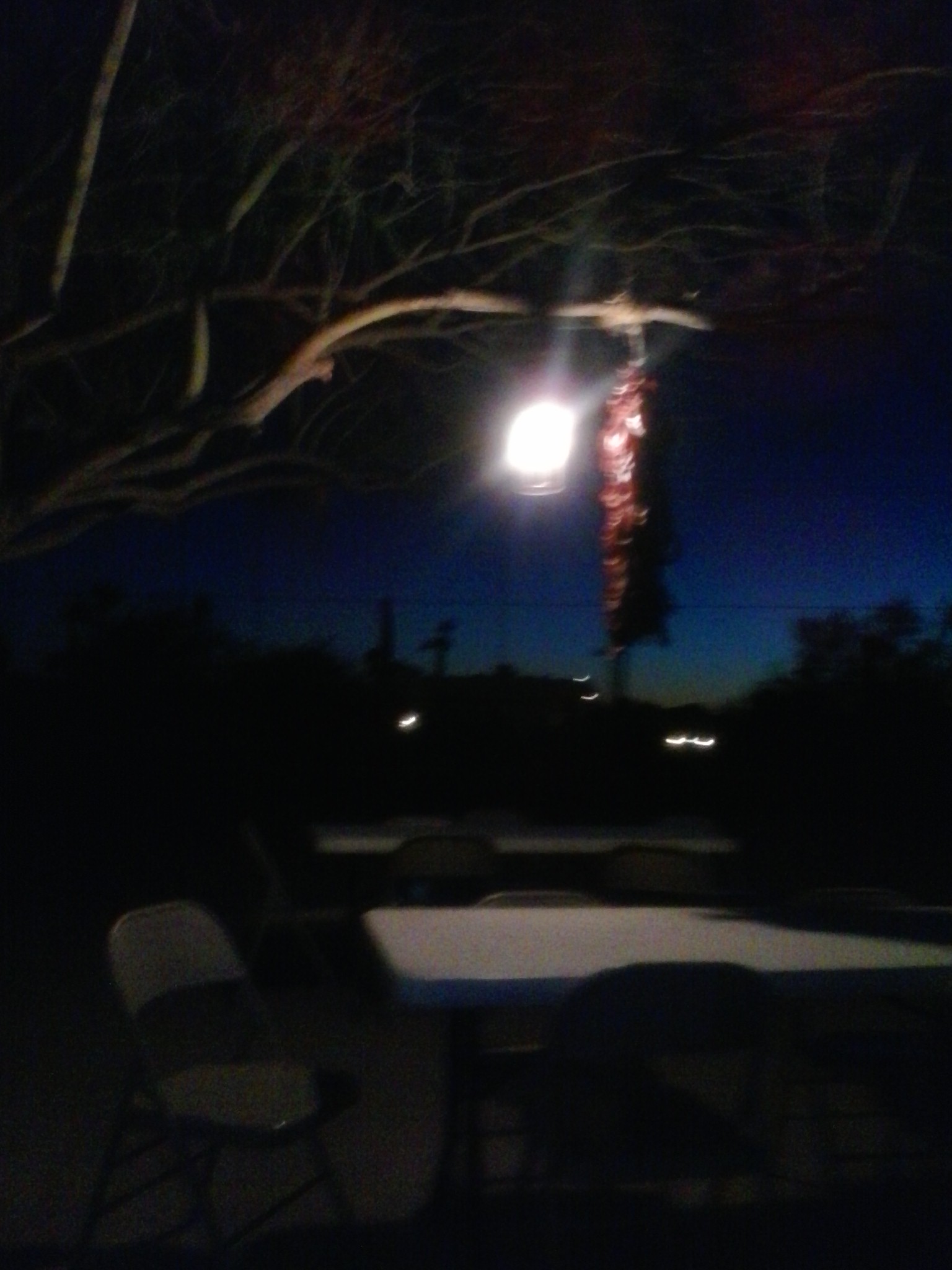 Cell phone camera shot of the tables at the El Semental food truck in Tucson, AZ. It was rather cold in AZ when the sun went down. On this particular evening it dropped from the mid 70s to the low 60s in about 45 minutes. At night it would drop down into the low 40s in Tucson, and the low 30s at the Grand Canyon. That’s cold for my thin CA blood!