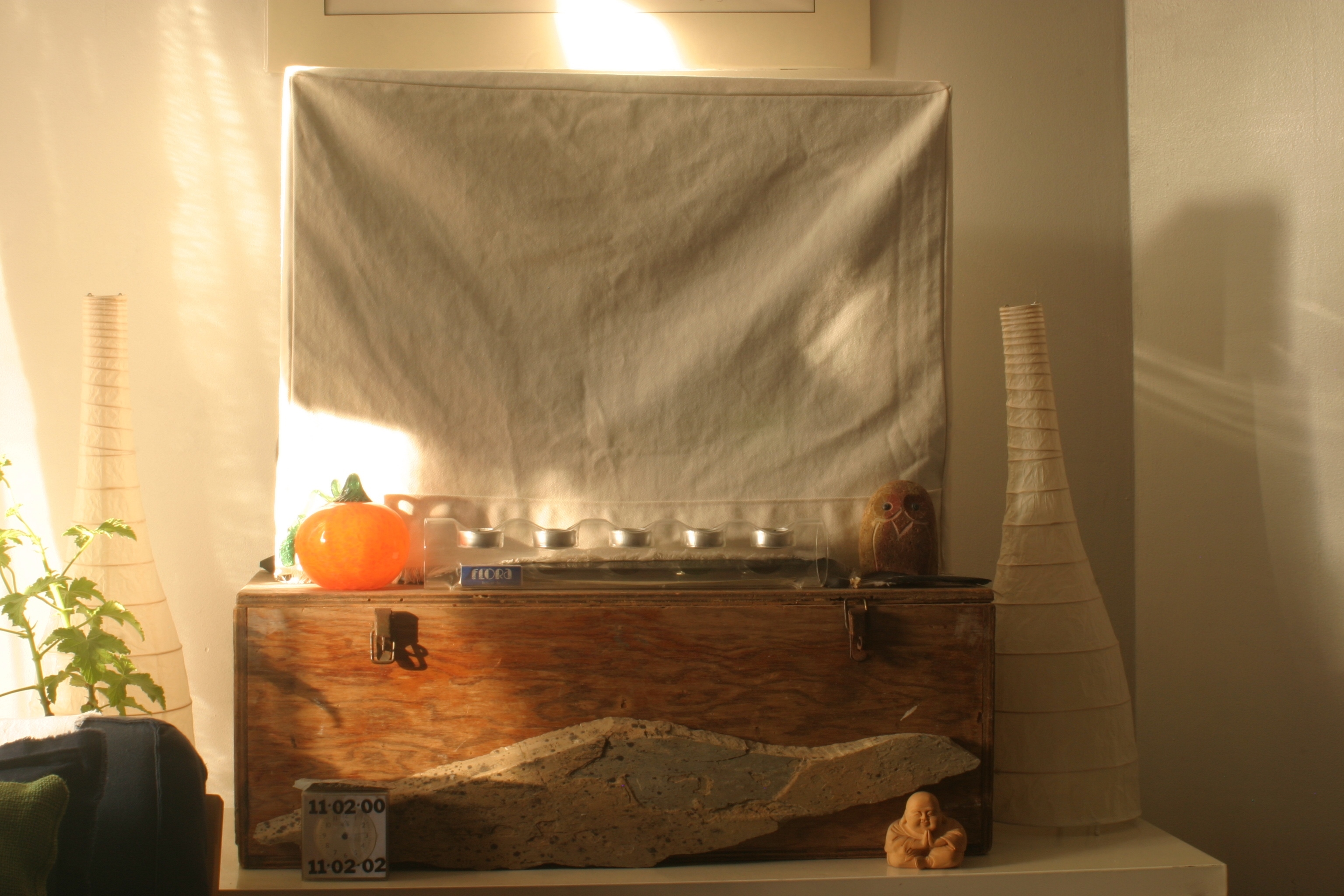 And lastly, Houseproud homestead tip number four: store fresh bread in cloth bags. Oh, if only I had a decent photo to show you of the light-weight muslin bread bag that I made this week! Alas, I do not. You must trust me on this, my dears: store fresh bread in a cloth bag and it will stay fresh longer. I bought a baguette on Wednesday, put it into the muslin bag I’d made, and as of this evening (Friday) it was still edible. It’s remarkable, really: the cloth keeps the bread from drying out (as it will in a paper bag) or from getting soggy (as it will in a plastic bag). Any thin cotton or linen bag will do, really – I tested the theory first with a simple (thin) cotton shopping tote and it worked like a charm. I’m still tweaking the bread bag that I designed, but I hope to have pictures to show you of the new and improved version for next week’s post. Until then, I leave you with a photo of the Houseproud homestead’s cozy-covered TV. (The dratted thing dominated the room before I slip-covered it, but now it just blends into the wall.) Keep cozy yourselves until next we meet, my pets!