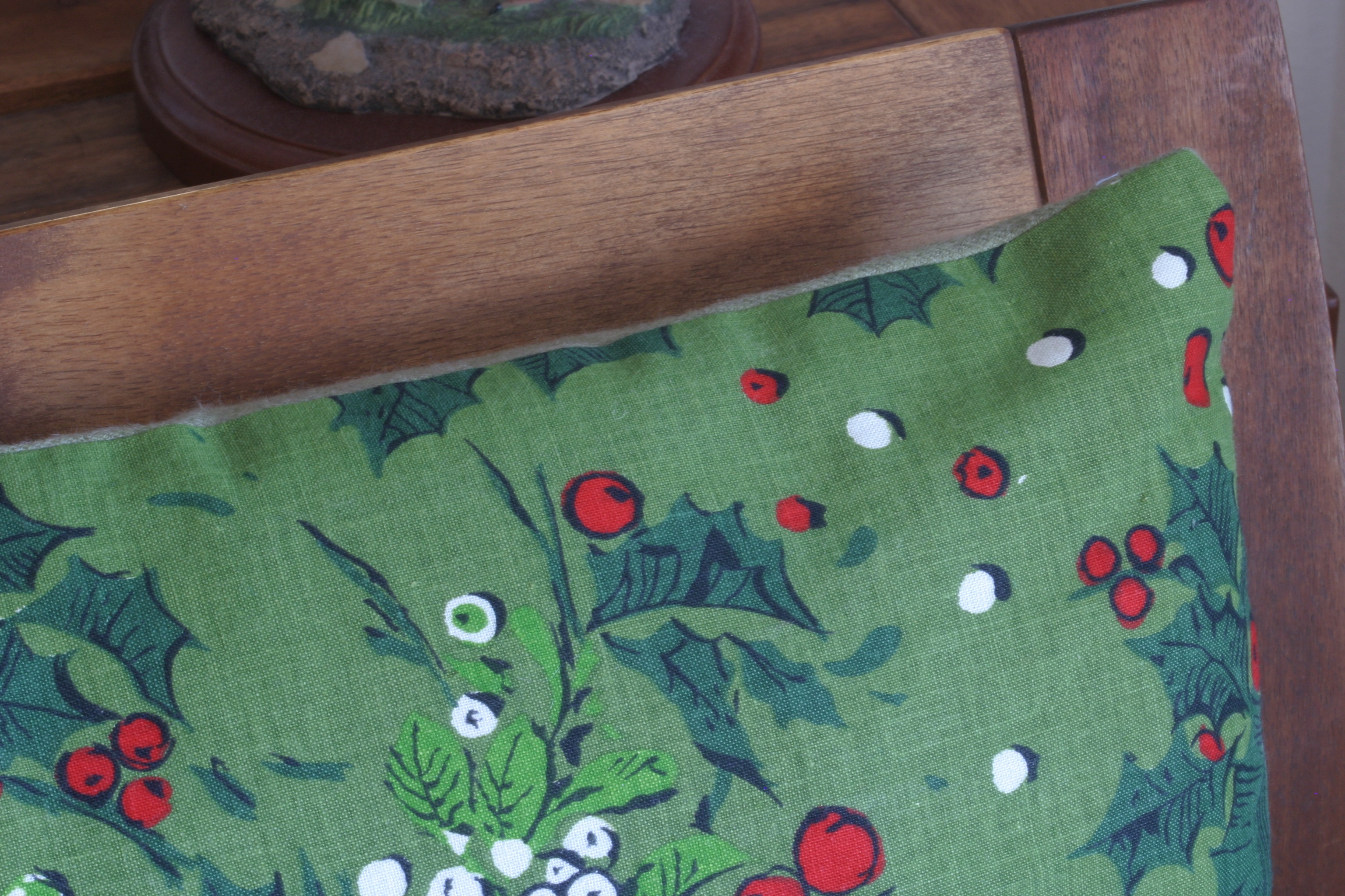 The tv corner of the Houseproud homestead’s living room, showing our collection of santas and elves. The little santa to the right of the long glass candle holder is a SMOKING santa that I purchased at Jutta’s Flowers ages ago. It’s one of my favorites! The elf to the right of the smoking santa is one that mum-of-mine purchased when she was a young woman. I suppose the tv cozy would look better if I ironed it, wouldn’t it? Also, doesn’t that holly pillow look lovely?