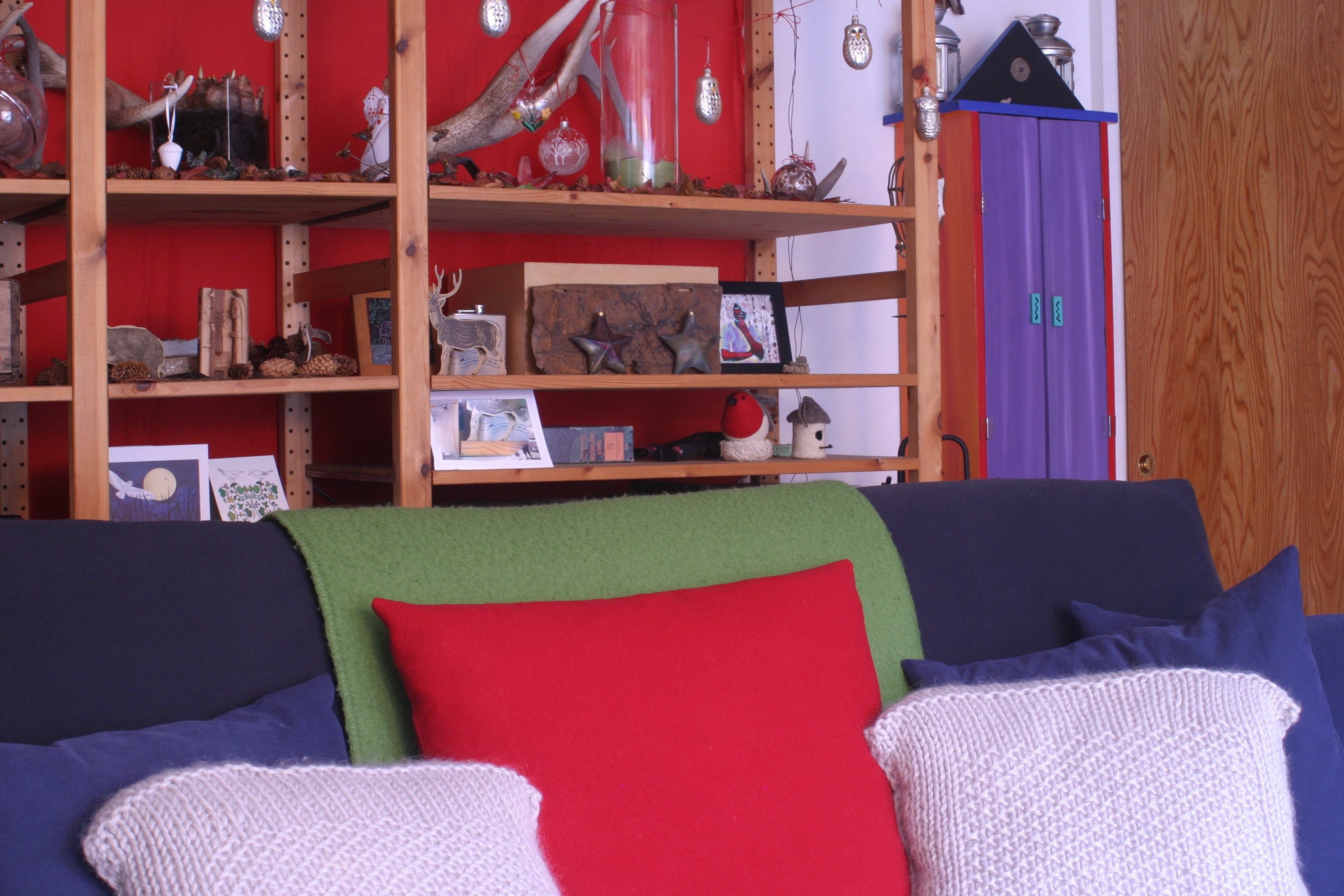 I made that red zippered wool throw pillow case this year, too. That red really pops, doesn’t it? The two off-white throw pillow cases were knit from thick wool a few years ago. They need button closures, I think (they close in the back like an envelope). I have green flannel all cut out and ready to be made into small zippered throw pillow cases to replace the blue ones you see here, but I ran out of time. I’ll make the new pillow cases in the coming week or so, in hopes that the green of the flannel inspires Ma Nature to send us some flipping rain already.