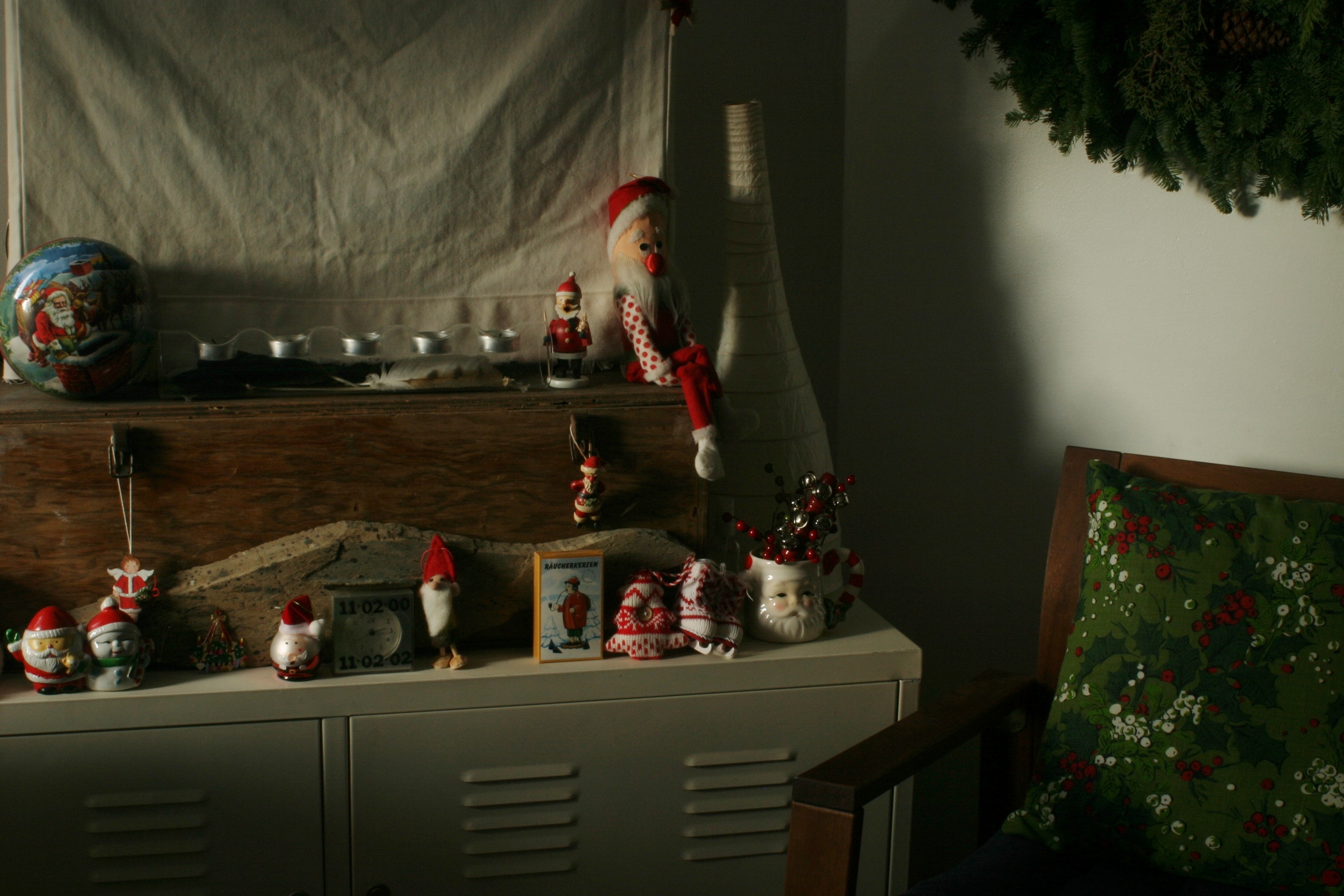 We don’t have enough room in our tiny apartment for a tree, so we hang wreaths or fir boughs instead. I hung a HUGE wreath on the wall next to the tv this year. I was going to decorate the wreath, but I decided to keep it bare instead. It’s quiet and serene, unlike the nearby joyous clutter of santas and elves. The wreath smelled SO good when I first brought it into the house – like being in a forest. I still get a whiff of forest when I walk past it. Mmmmm, I do like that smell …