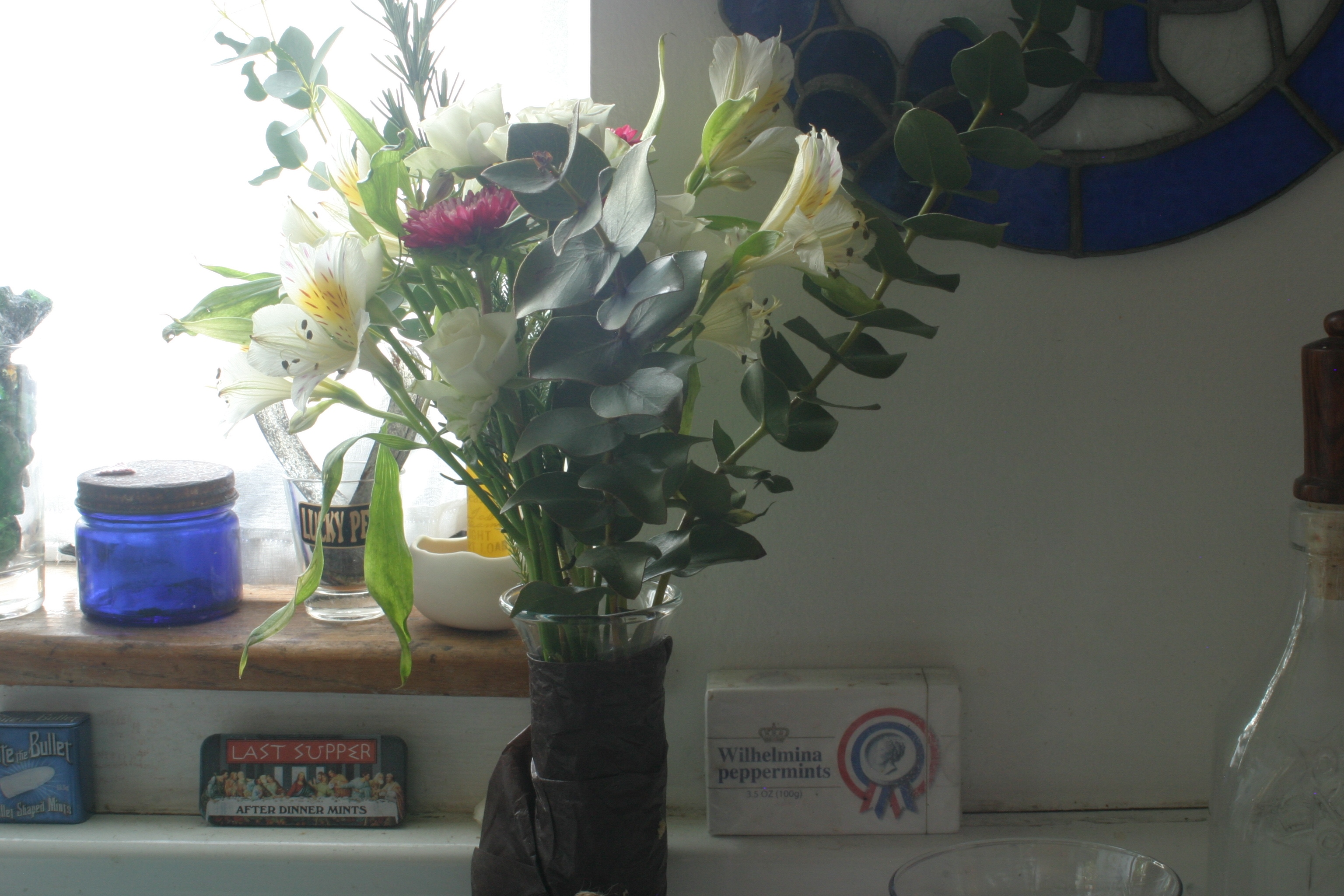 I recently started placing small flower arrangements in the Houseproud homestead’s kitchen. These are from my favorite flower shop, Dandelion (on Park Street here in Alameda). The owner, Karim, has such an eye for color and design – she and her shop are an inspiration to me. She started off selling lovely little arrangements like this one at shops around Alameda, then took the plunge and opened a shop of her own. She’s sweet and beautiful and as brave as ten thousand lions. I want to be her when I grow up.