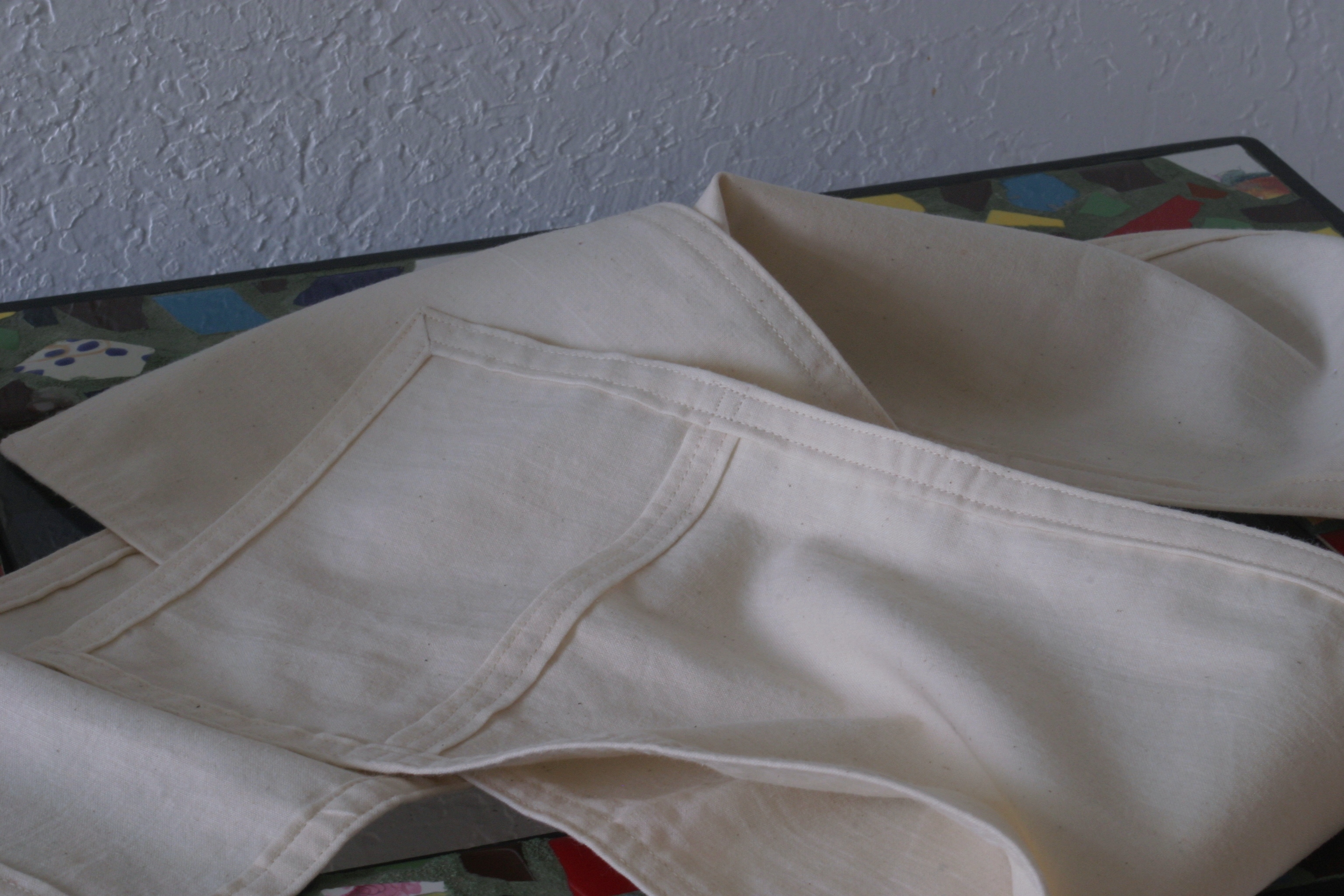 Actually, the project that inspired me to master mitered corners wasn’t the napkins. It was the bread bags that I designed (the napkins were just a happy afterthought). I mentioned the bread bags a few posts ago, with a promise to promptly post some pictures, but the first few samples I made were not quite right so I didn’t want to show ’em. This version took a lot of tinkering with different types of seams, but it was well worth the fuss. The careful seaming makes the bags very sturdy (although it also takes much more time to sew these than would simpler seaming). Mosey on up to the top of this post if you’d like to see another view of the bread bags. The bags look good and work great, and I’m a happy crafter.