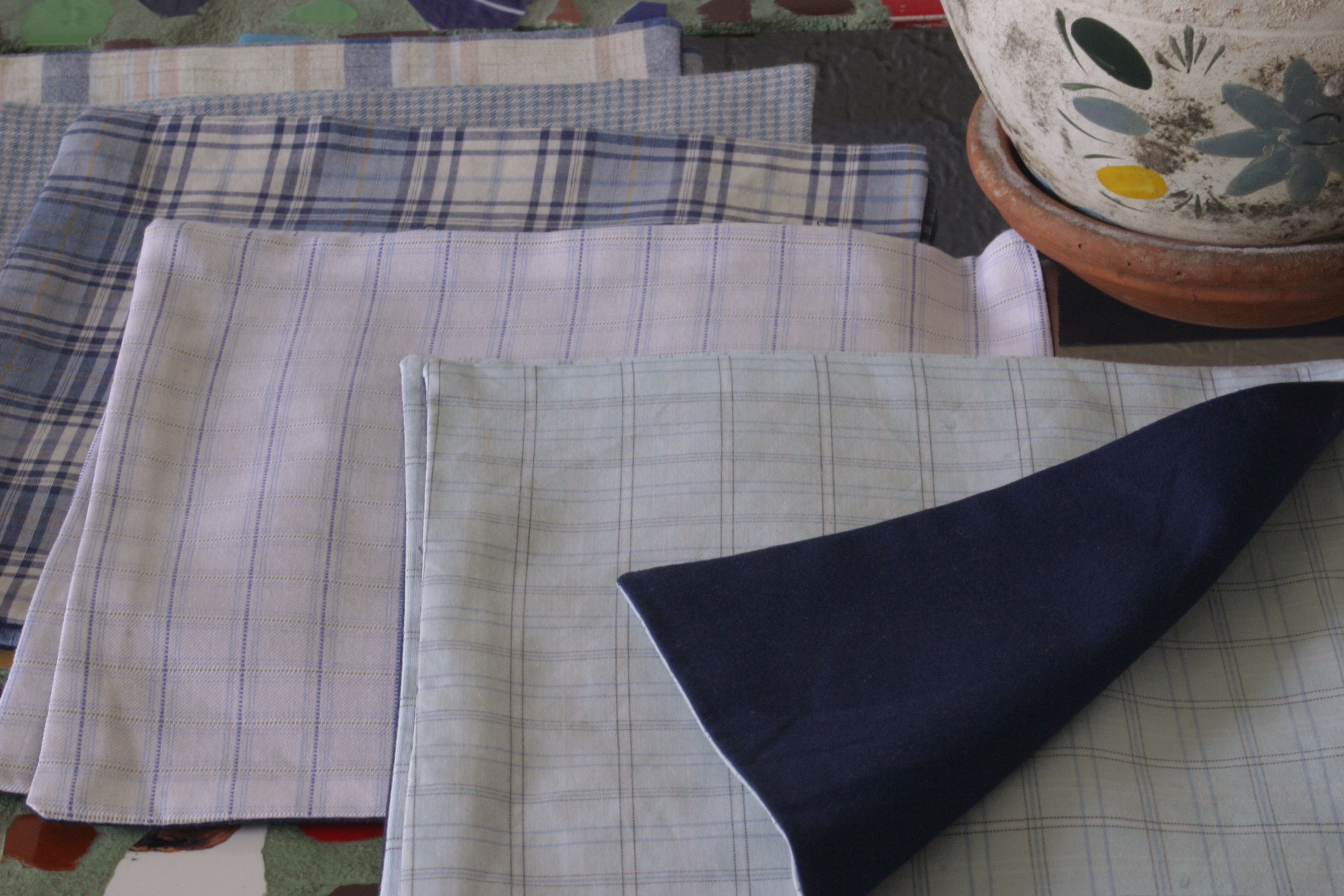 And while we’re on the subject of napkins, let’s take a look at the small double-sided cocktail napkins I made, too. Unlike hemmed napkins, double-sided napkins are a breeze to make – just cut matching squares from a solid fabric and from a small-patterned fabric, place right side together and machine stitch all hems, leaving an inch or so of one hem unsewn. Turn right-side out, iron, hand sew the small gap shut, and you have yourself a napkin. Pretty cool, yes? The plaid fabric I used were from the Mister’s old shirts, and as the napkins were intended as a gift for the Mister, I was sure he’d like the colors. If you want to make some double-sided napkins for yourself, don’t do as your little munakins did and make your first batch out of plaid fabric (plaid will show any sewing mistakes); instead use a small, all-over pattern and save yourself some heartbreak.
