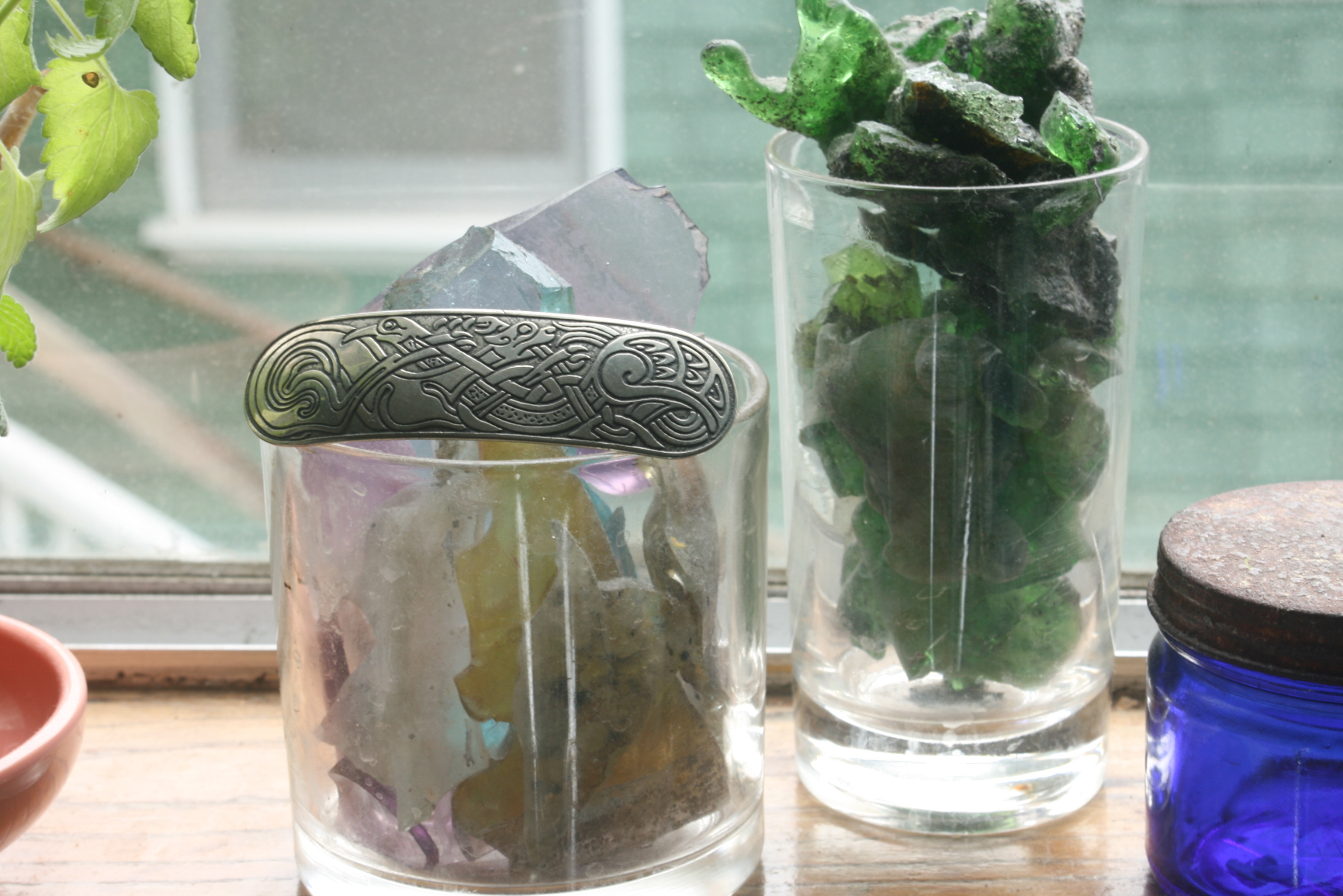 Small glass votive jars on the Houseproud homestead’s kitchen window ledge, filled with pretty glass I’ve found on my hikes. The silver brooch was a gift from Tom, our neighbor, who passed away recently. Rest in peace, Tommy – I picture you in a cafe right outside heaven’s front gate, giving St. Peter and the folks coming in all sorts of trouble as you sit there sipping coffee, smoking cigarettes, and making friends with the passing dogs. Save me a chair at the cafe up there, sweetheart. I miss you lots.