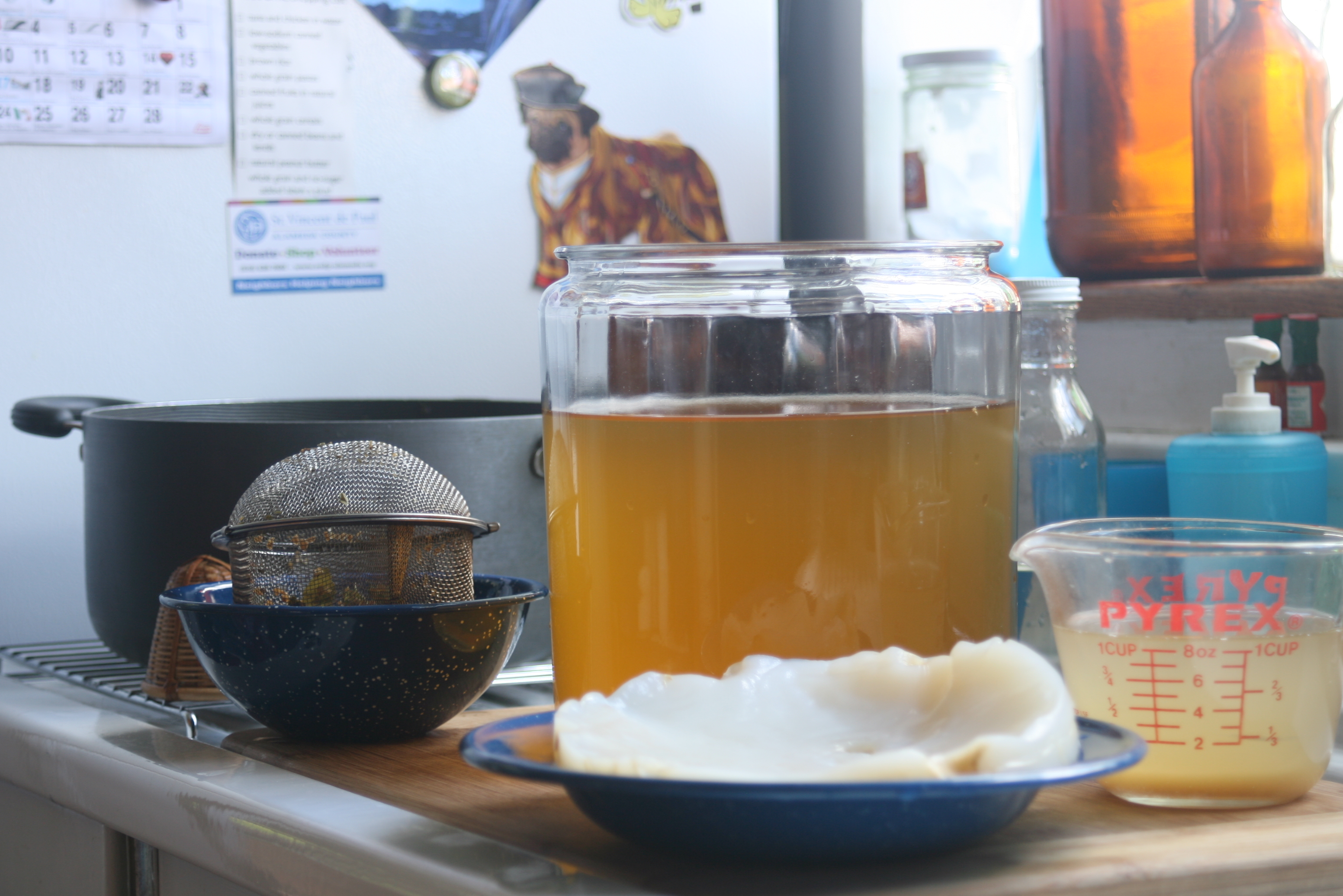 Still life with kombucha. That’s the mother in the shallow bowl in the foreground. The fermentation jar has been washed & refilled with fresh (cold) sweet tea, and the measuring cup holds a cup of kombucha from the last batch. I use that ENORMOUS tea ball to brew the tea overnight in the old Circulon pot that’s in the background.