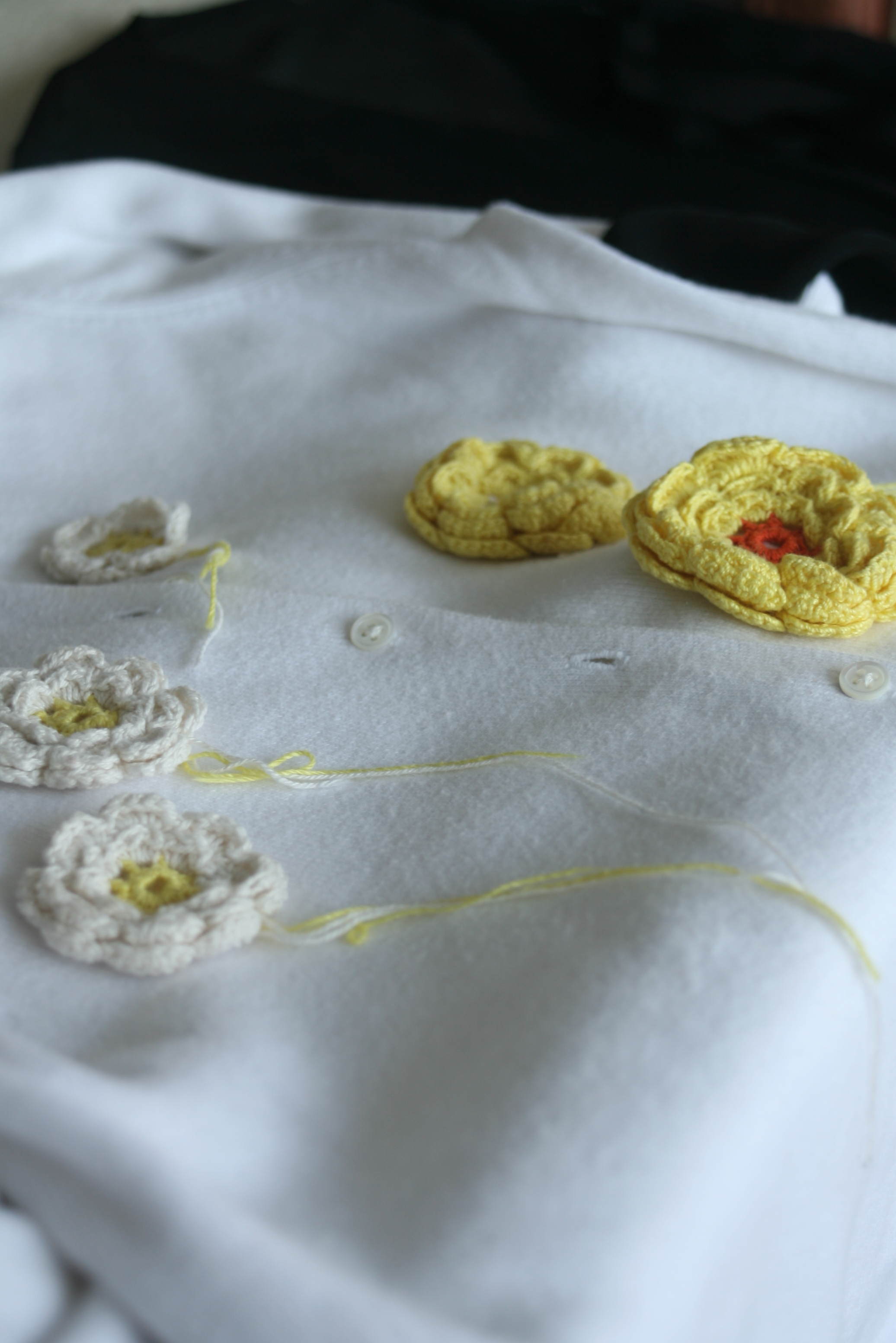 As a side note, the crochet flowers weigh down the front of the sweater a bit – not terribly so, but enough to slightly annoy me. I can’t apply counterweight flowers to the middle or bottom of the cardie’s back, as they would catch on things or poke me when I sat back, but I’ve been toying with the idea of sewing addition flowers to the back neck, or all the way around the collar. Some of the flowers arranged at the top of the cardigan are from my stash, and others are flowers that I linked together to form a necklace (you can see the bead I used as a closure for the necklace at the end of the cord on top right of the cardie). The flowers themselves are based on a pattern I got from an old book, and they make great travel projects. If Mum-of-Mine and I take Amtrak to Glacier this summer (!!), this is the kind of project that I’ll bring for the trip. The resulting flowers will get stashed away, and who knows what use they’ll get put to in the end?