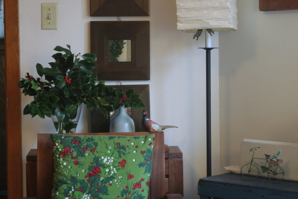 A corner of the Houseproud homestead’s living room. Do you see that lovely vase between the holly and the pheasant? It was a gift from Michael-Michael-Michael and Edna Louise. The bike in the foreground was a sweet little stocking stuffer from mum-of-mine.