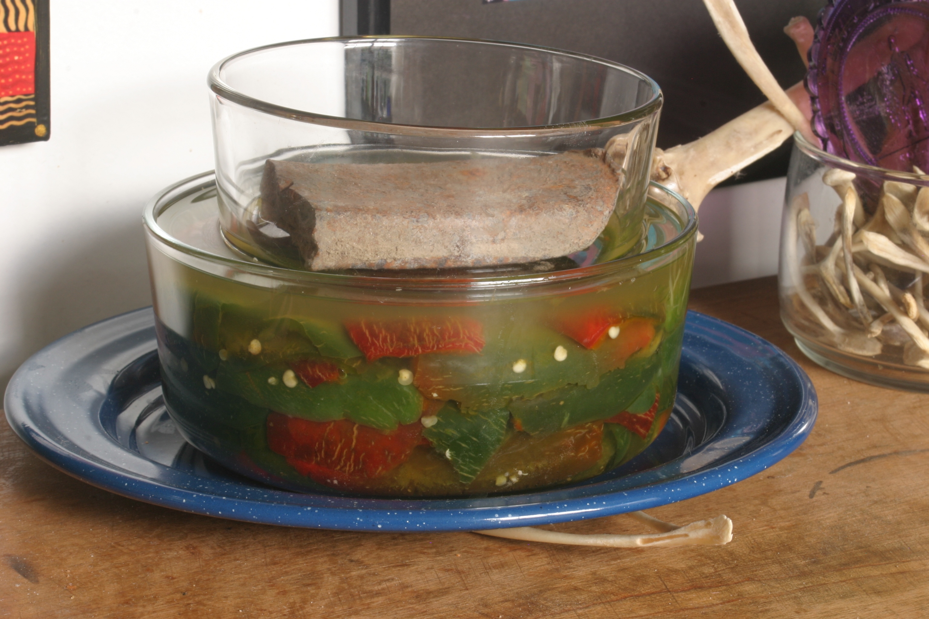 This is my second batch of fermented hot peppers (mainly jalapenos, and mostly green jalapenos at that). I didn’t roast this batch – I just cut them in half and removed the seeds and veins. It’s been much colder than when I fermented the previous batch, so it’s taking a little longer for this one to start fermenting. I’m keeping a careful watch on it this time around!