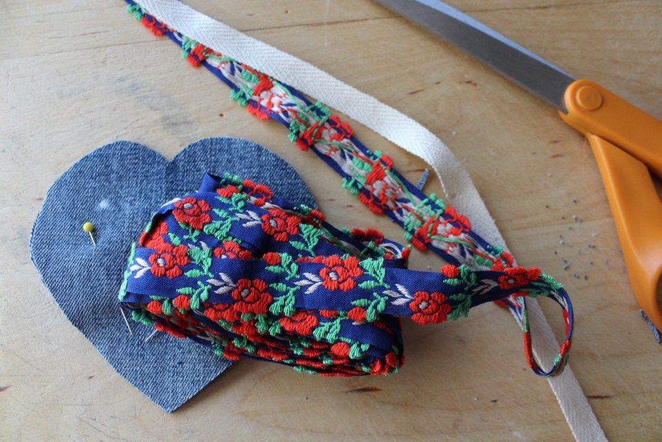 Houseproud heart charm WIP IMG_1175 ← Previous Next → This trim from M&J Trimming NYC just needed a little reinforcement to serve as loop. The trim looks very sweet with the denim, but it’s too wide for a charm this size – sewing it in gave the heart a squared shoulder on that side.